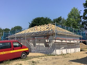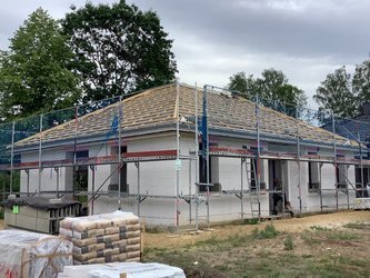 Sie verfügen über ein schönes, weitläufiges Wohnzimmer. Die abgeschlossene Küche hat einen direkten Zugang zum gemütlichen Essbereich. Das geräumige Schlafzimmer sowie zwei weitere Zimmer und das Bad runden das Raumangebot im Winkelbungalow 108 ab.