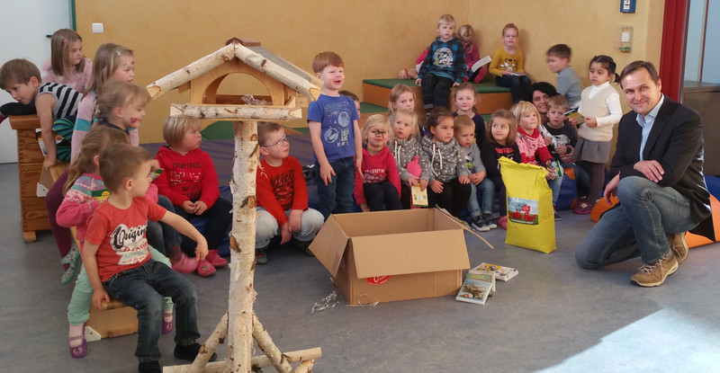 Thomas Engellandt war zu Gast im Kindergarten "Am Jordan" in Schneverdingen um ein umfangreiches "Entdecker-Paket" rund um das Thema heimische Vögel, sowie ein Vogelhaus zu übergeben.